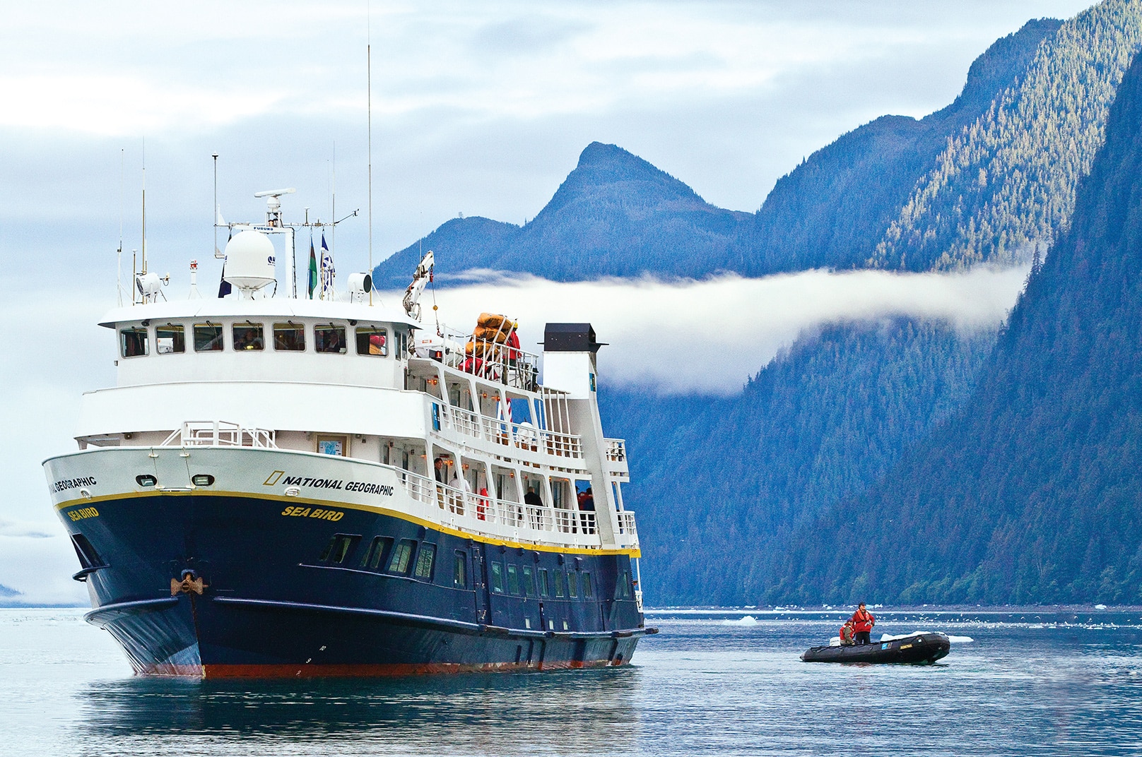 Earlier in the day, we’d seen the big ships of Holland America Line and Royal Caribbean International pass by in the distance en route to Glacier Bay. How smug we’d felt, just 60 of us (plus crew) aboard the compact National Geographic Sea Bird, dawdling about the glaciers and tiny coves, stopping here and there for a hike or kayak. Compared to cruising aboard these giants of the sea, it’s like being on an eight-day shore excursion—and we’re loving it.