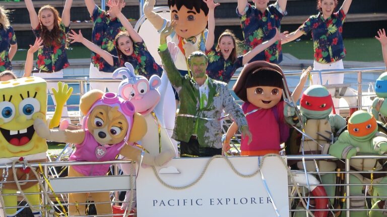 More than 100 children joined Dora, SpongeBob SquarePants and the Ninja Turtles in a rousing event. ย Instead of a bottle of champagne over her bows, a huge tub of green slime was dumbed over P&O’s president Sture Myrmell.