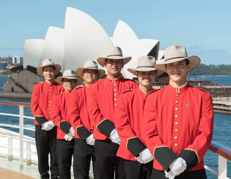 The famous red-and-black Cunard bellboys will be dressed in a uniform being designed by R.M.Williams. Akubra hats will form part of their new look.